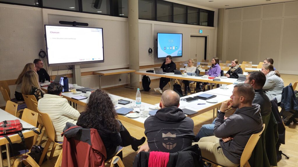 Impulsvorträge verschiedener Teilnehmer:innen zu geplanten Fortbildungsformaten sowie Erfahrungen aus praktischen Erprobungen einer Unterrichtsreihe aus dem Tübinger Projekt DiGebiS (=Digitalisierungssensible Gesundheitsbildung im Sportunterricht) sorgten für angeregte Diskussionen und einen gewinnbringenden Austausch. Ein Selbstlernmodul als Teil der Fortbildungskonzeption wurde vorgestellt und ausprobiert. Das hilfreiche Feedback hierzu dient zur Weiterentwicklung des Moduls. Auch in den Pausen kamen die Teilnehmer:innen bei Kaffee, Kuchen und Snacks ins Gespräch.