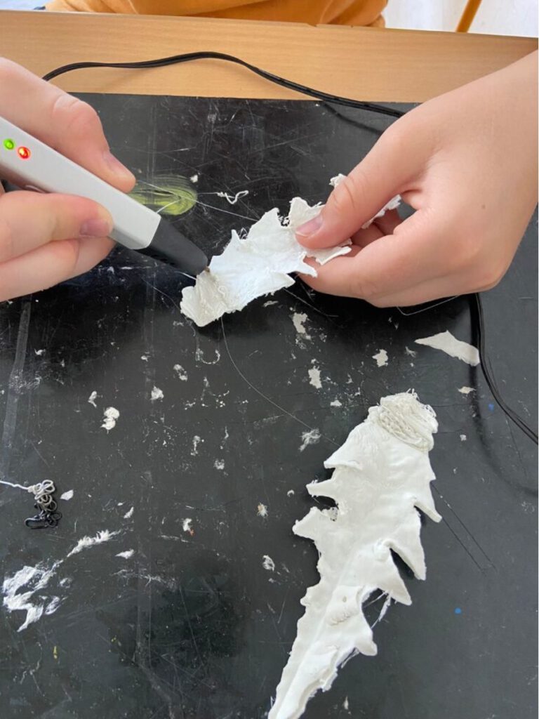 Ziel war es, den Teilnehmenden ein freies, experimentelles Arbeiten mit unterschiedlichen künstlerischen Techniken zu ermöglichen. Neben klassischen Materialien kamen auch 3D-Drucker, 3D-Scanner, VR-Brillen und 3D-Stifte zum Einsatz. Die Schüler:innen arbeiteten mit Laptops und iPads, erkundeten verschiedene Programme und setzten eigene Ideen individuell um.